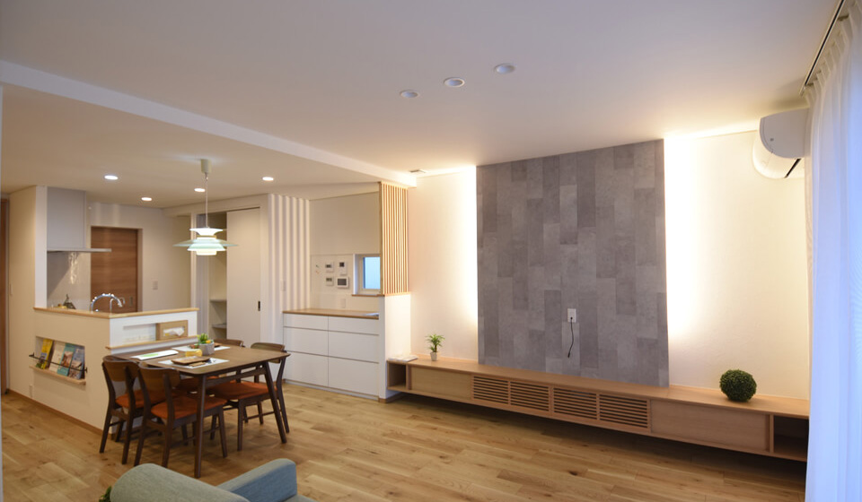 家族が集まる広いLDKに大きく断熱性の高い樹脂サッシで、陽射しを沢山取込む&しっかり断熱の工夫がされています。構造は、米松・ヒノキ・杉を使用し、仕上げには温かみのあるナラ材、パイン材の無垢を使用。社外設計事務所案件で、デザイン性の高い家具や建具も必見。
