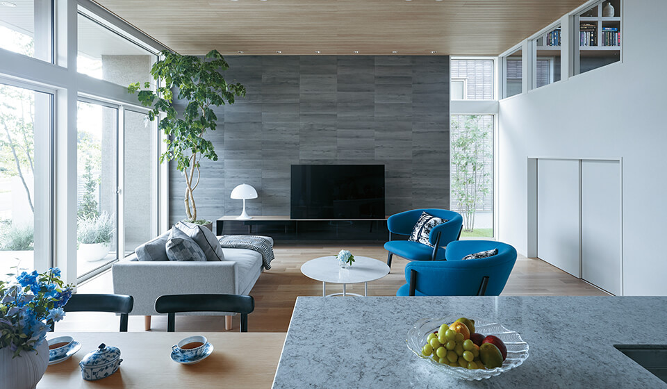 太陽の光も、自然の風景もすべてがインテリアになる、3mの天井高と大空間設計のリビング。光が注ぐ南北の開口の抜けが、風が流れる通り道となり、開放感を演出する大きな要素となっています。バーベキューなど多目的な楽しみ方ができるテラスもあり、まさに豊かな時間をつくりだしてくれる住まいに。