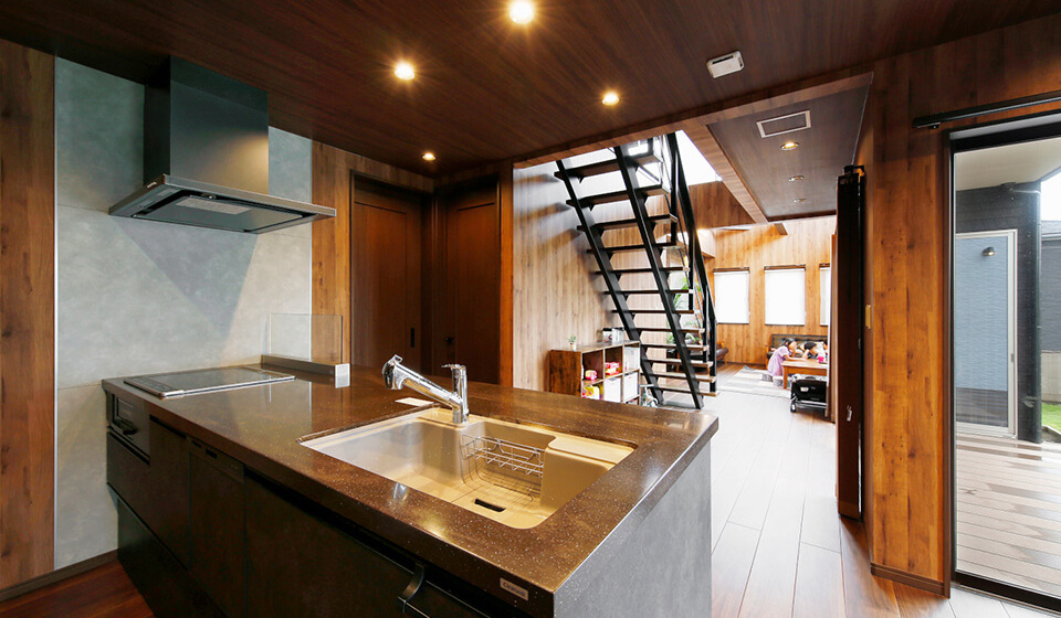リビングも、ウッドデッキも、階段も見渡せる開放的なキッチン。料理をしながらでも、子どもたちの様子を見守ることができる間取りが特徴です。スケルトン階段を取り入れたのはオシャレさだけでなく、2階にいても吹き抜けを通して気配を感じられるから。キッチンはできるだけ生活感のないスタイリッシュなデザインのものを採用し、全体的にスッキリとした雰囲気にまとめました。